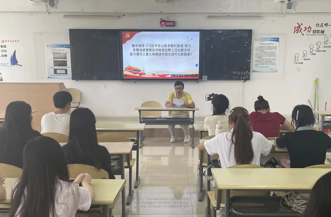 接着鲁华领学关于《习近平在山西考察时强调 努力在推动资源型经济转型发展上迈出新步伐 奋力谱写三晋大地推进中国式现代化新篇章》,他说作为大学生党员我们应坚定不移沿着总书记指引的方向前进,要勇挑重担,发挥先锋模范作用,积极投身转型发展实践,以科技创新为驱动,助力传统产业焕新,为奋力谱写三晋大地推进中国式现代化新篇章贡献力量 ,向着更加美好的未来奋勇前行!