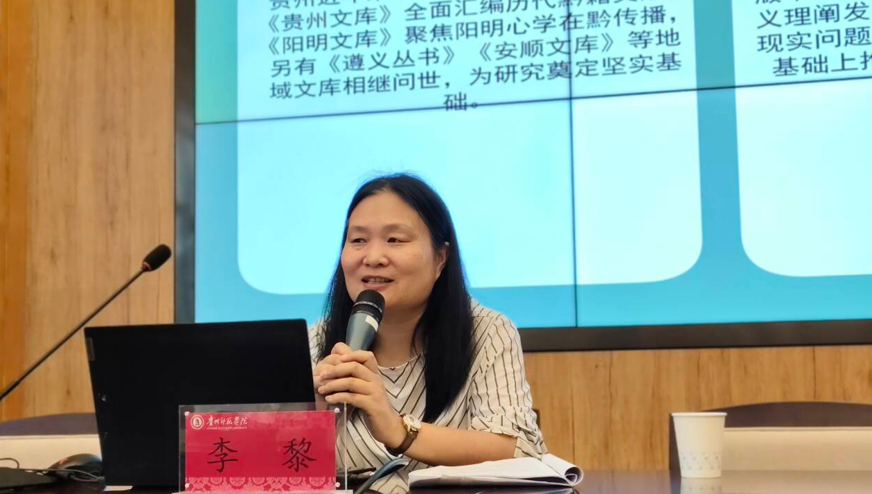 李黎教授作为贵州省文史馆特约研究员,兼任《贵州文库》总纂办公室编纂,贵州省历史文献学会理事、贵州省古典文学学会理事。主要研究方向唐宋明清文学、地域文学。先后发表学术论文三十余篇。讲座中,李教授特别强调了文献整理与文献阐释的结合,以及在贵州古典文献研究中尤须注意“边省”与“中心”的互动关系研究。