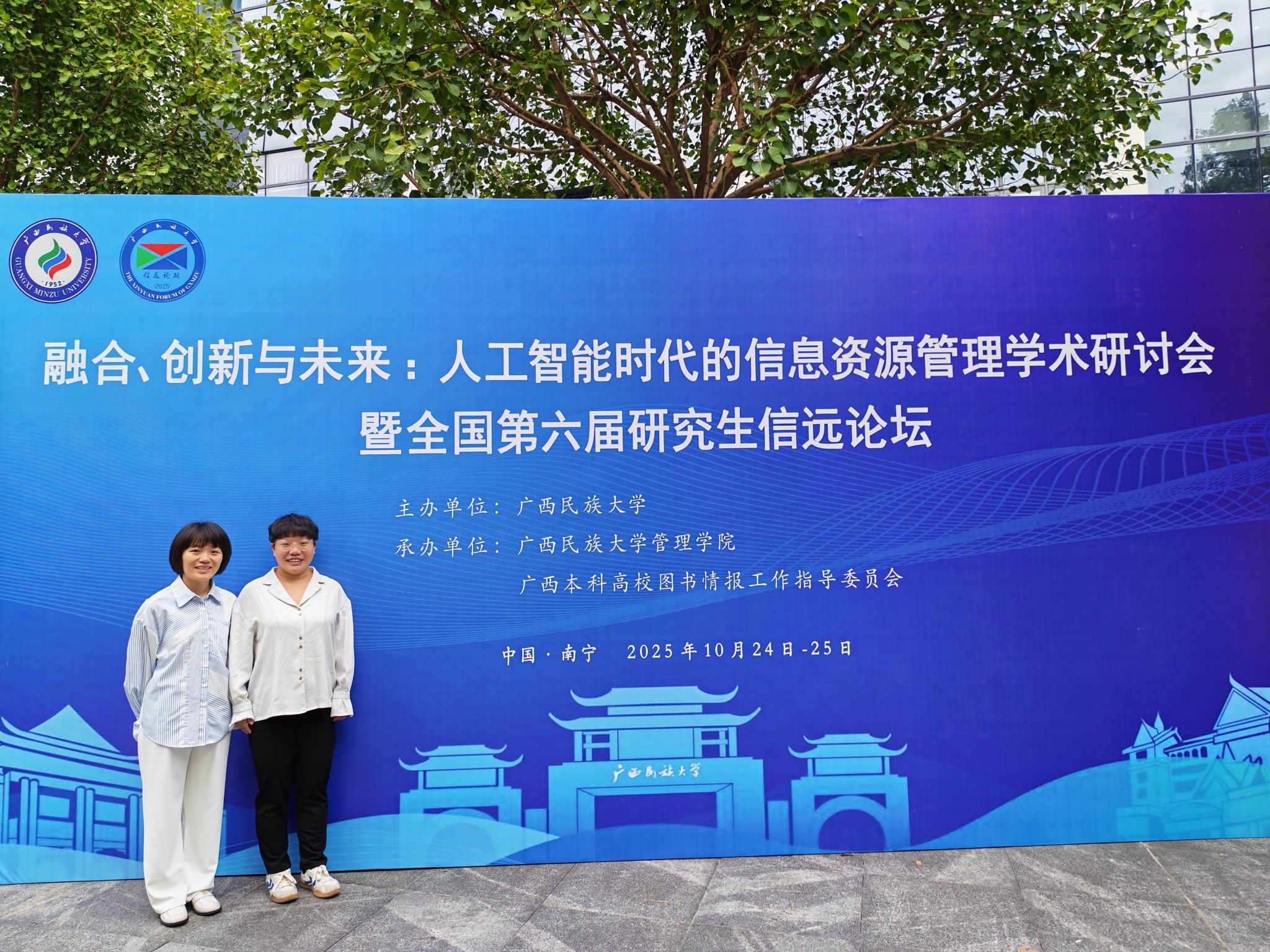 10月25日,由广西民族大学主办,广西民族大学管理学院和广西本科高校图书情报工作指导委员会承办,以及《图书情报工作》《档案管理》《档案与建设》《档案学刊》等期刊支持的、“融合、创新与未来:人工智能时代的信息资源管理学术研讨会暨全国第六届研究生信远论坛”,于南宁召开。我校伟德bv1946官网教师瞿智琳、向礼花受邀,参加此次学术盛会。