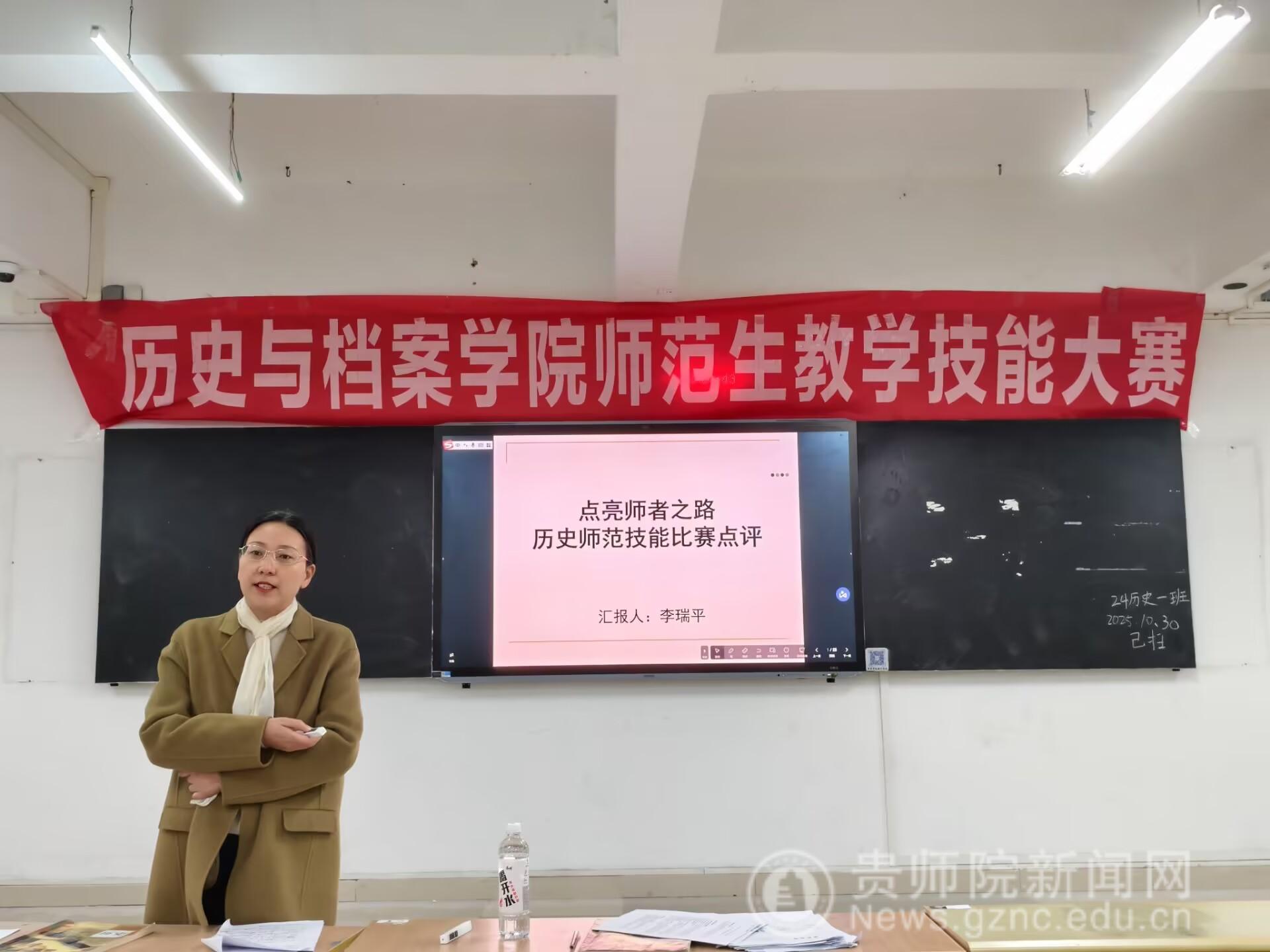 李瑞平首先,解读了比赛的整体设置与参与价值,指出本次比赛涵盖教学设计、模拟授课、史料分析三大核心环节,不仅是技能比拼的赛场,更是未来教师潜力的集中展示平台。她强调,比赛本质是对“未来历史教师”核心能力的检验,选手在表现中需同时体现历史知识掌握度与教学实践能力,为后续胜任课堂教学奠定基础。