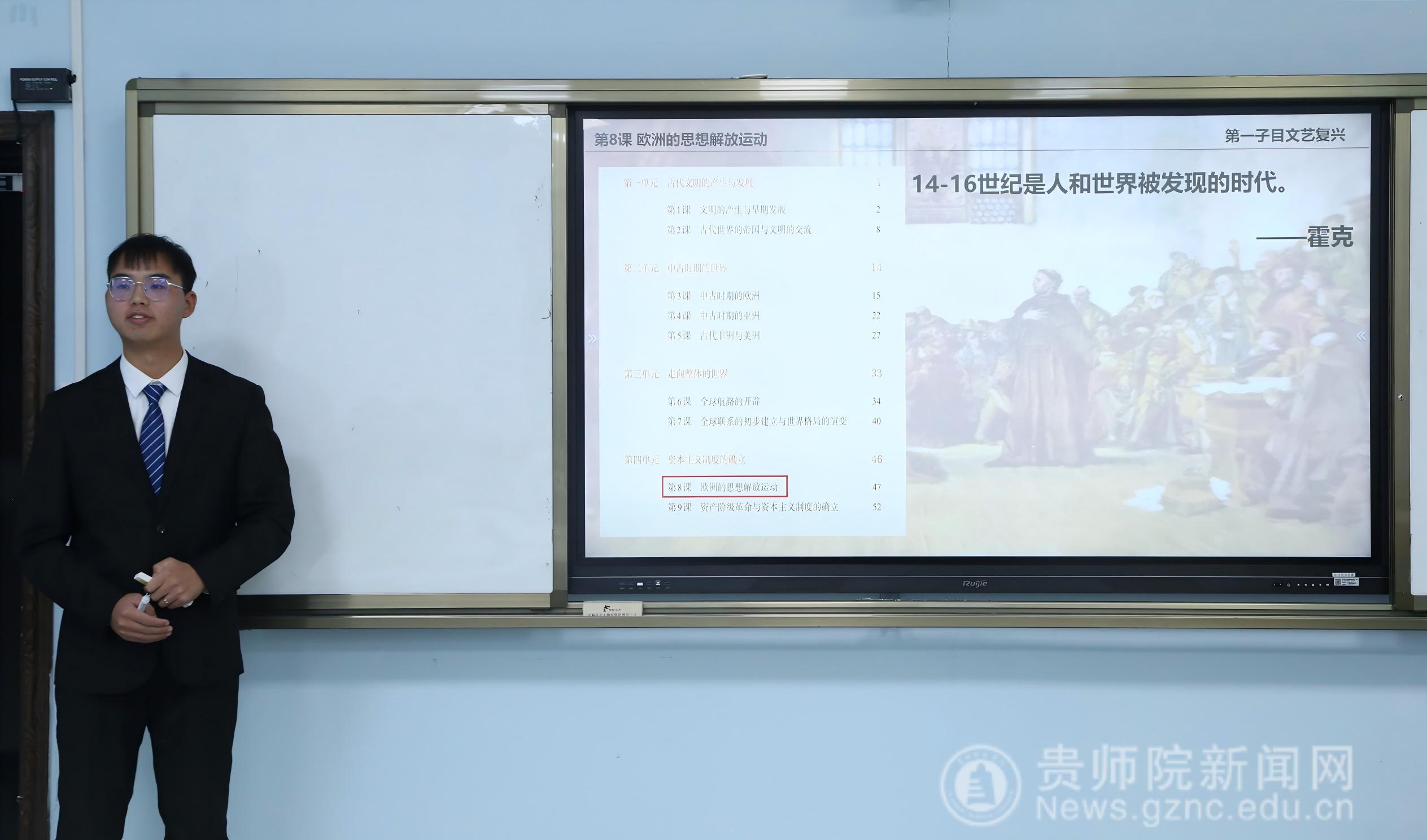为锤炼师范生教学本领,夯实从教基础,伟德bv1946官网于11月12日,在综合楼405教室,成功举办优师计划学生教学技能大赛。大赛面向本院2023、2024级优师计划学生,以“以赛促学、以赛促练”为宗旨,优师生负责人朱更勇副教授、历史系主任梁中美副教授担任评委。