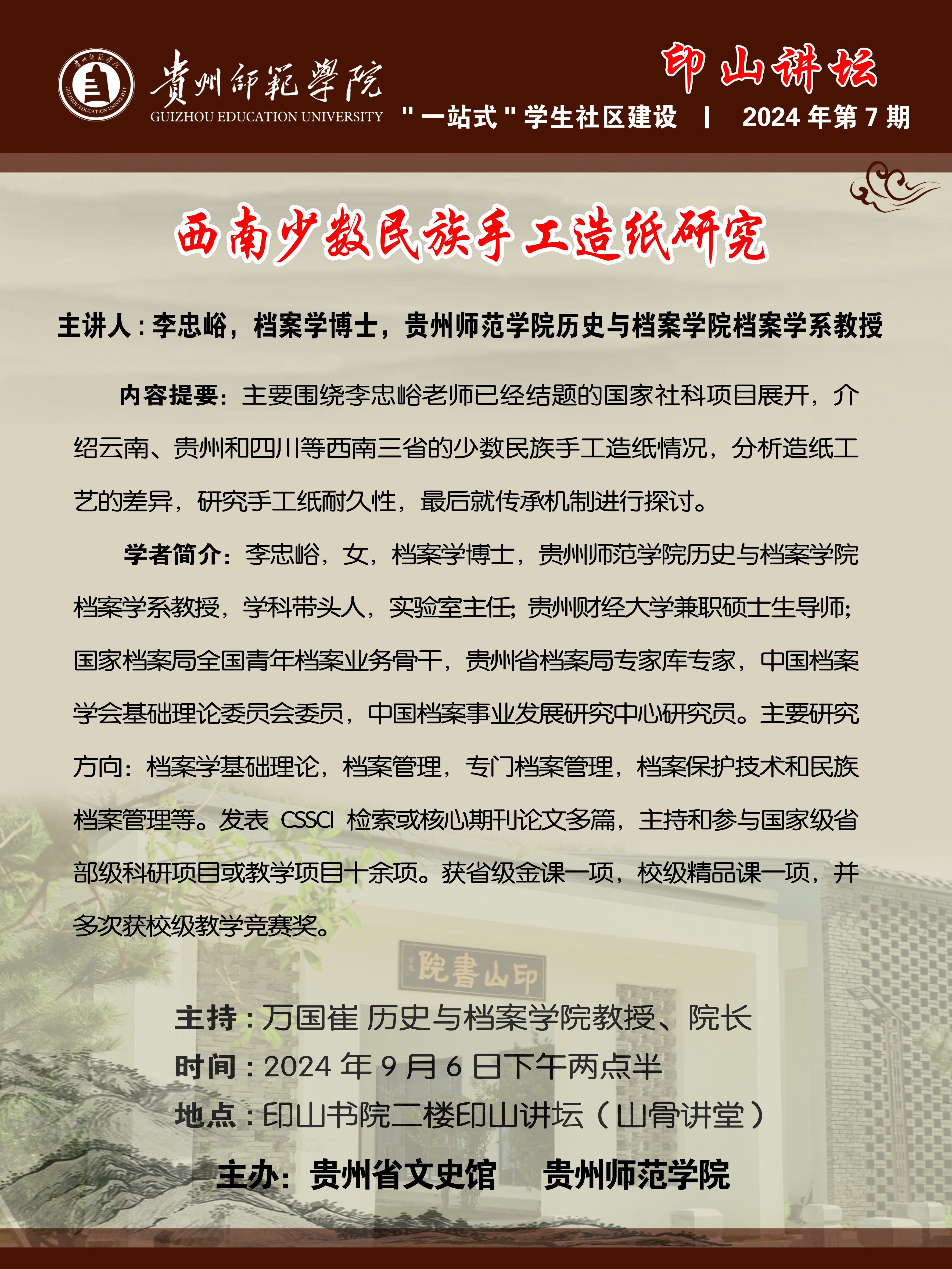 9月6日,“印山讲坛”系列讲座第七期、题为“西南少数民族手工造纸研究”的学术讲座,在印山书院二楼“山骨讲堂”举行。讲座由伟德bv1946官网档案学系李忠峪教授主讲,伟德bv1946官网院长万国崔教授主持,吸引了贵州省地方志编纂委员会办公室地方史处朱允祥和我校文史专业百余名师生到场交流、学习。